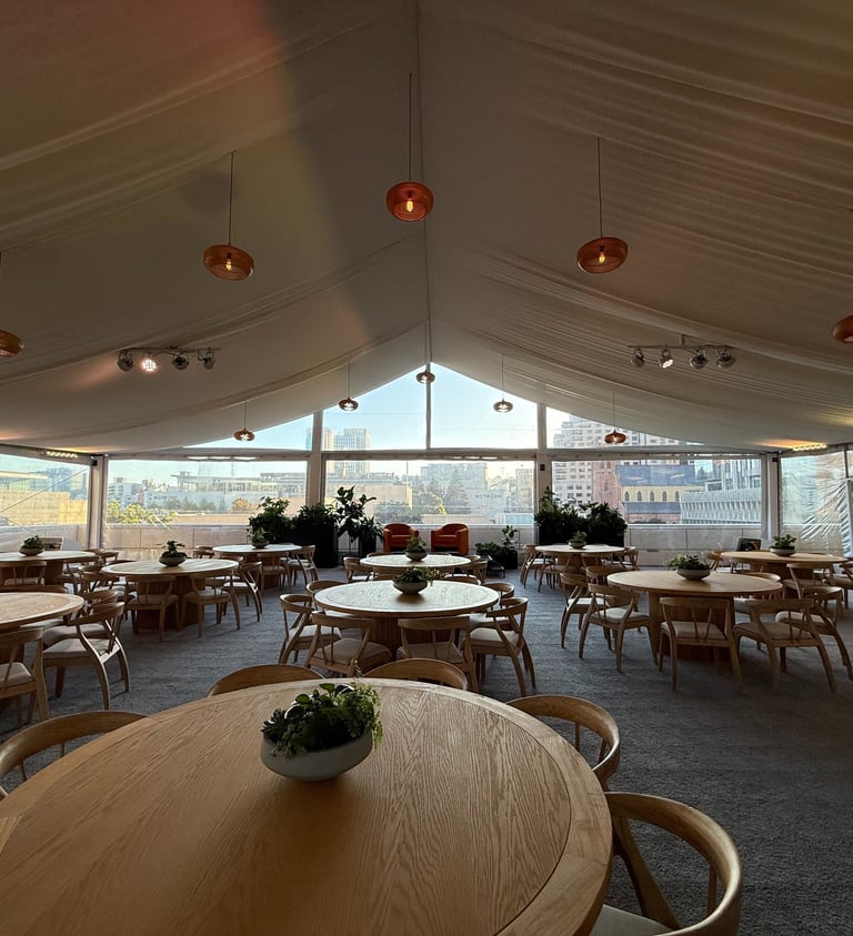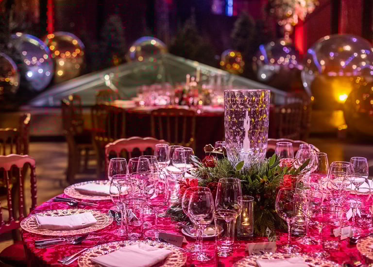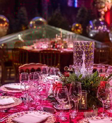 Design and styling for a seasonal gala, creating refined tablescapes and atmospheric tent environments with a timeless, non-seasonal approach.